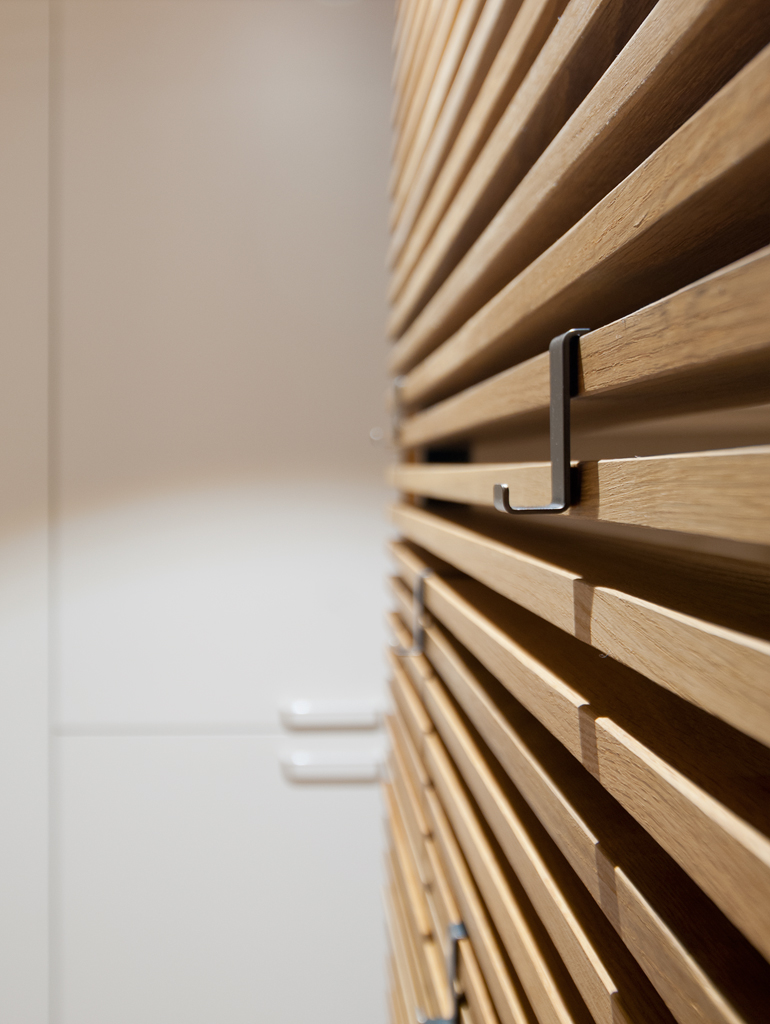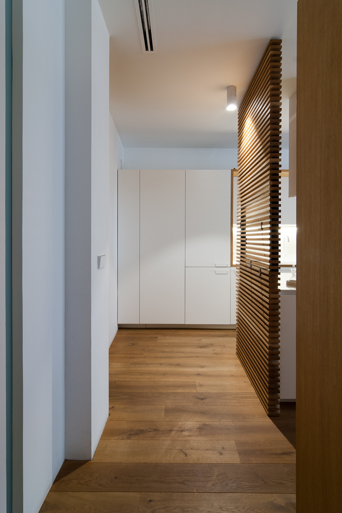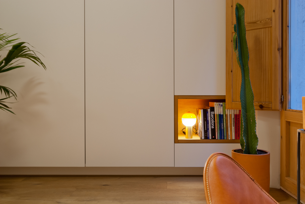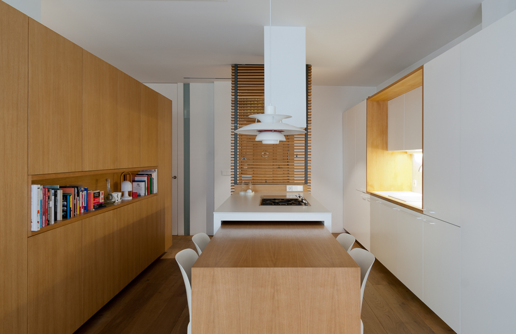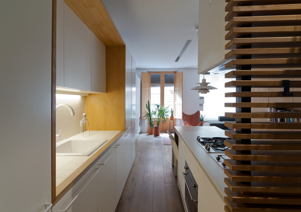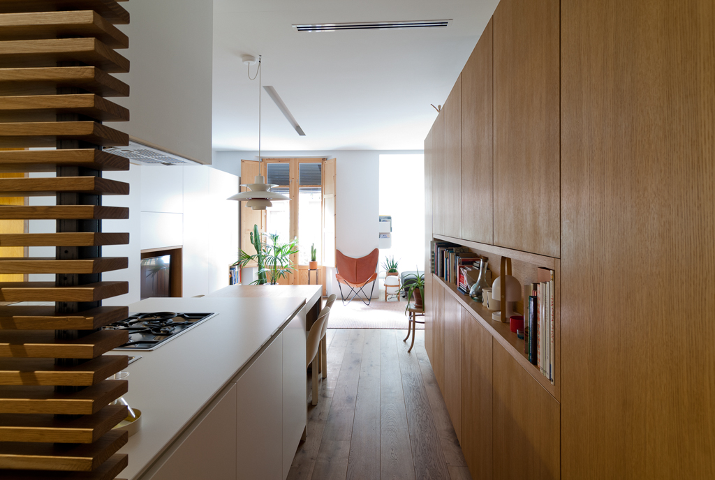 Se diseñó una zona de día diáfana, orientada a la mejor luz natural. En ella se integra el salón, el comedor y la cocina en un único espacio, optimizando cada metro cuadrado con mobiliario a medida. Esta línea de mobiliario longitudinal alberga almacenaje, electrodomésticos integrados e incluso una cama abatible, y se complementa con una isla, una mesa extensible y una segunda estructura que separa visualmente el resto de la vivienda.