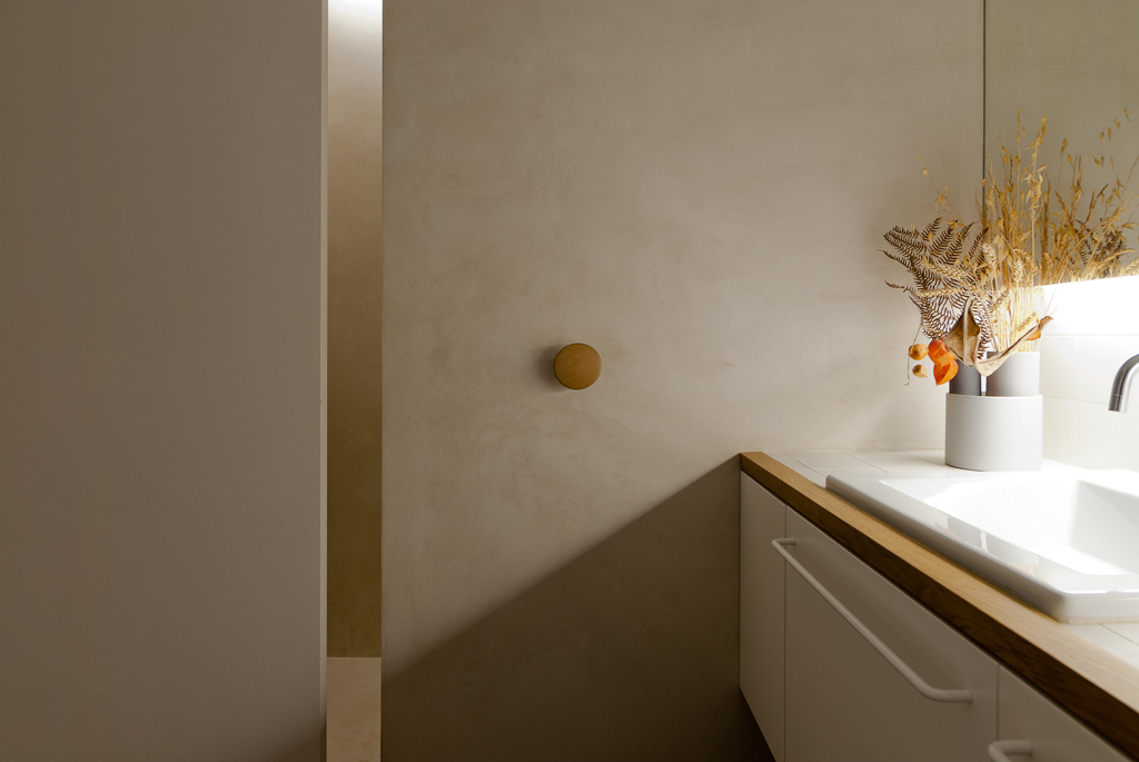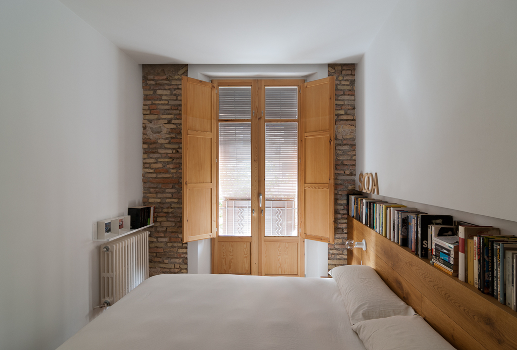 La zona de noche —baño y habitación auxiliar— se reubica en la parte posterior, ventilada a través de un pequeño patio interior. Materiales naturales como la madera, el estuco de cal y un muro de ladrillo aragonés recuperado dotan al espacio de una atmósfera cálida, serena y coherente con la historia del inmueble.
