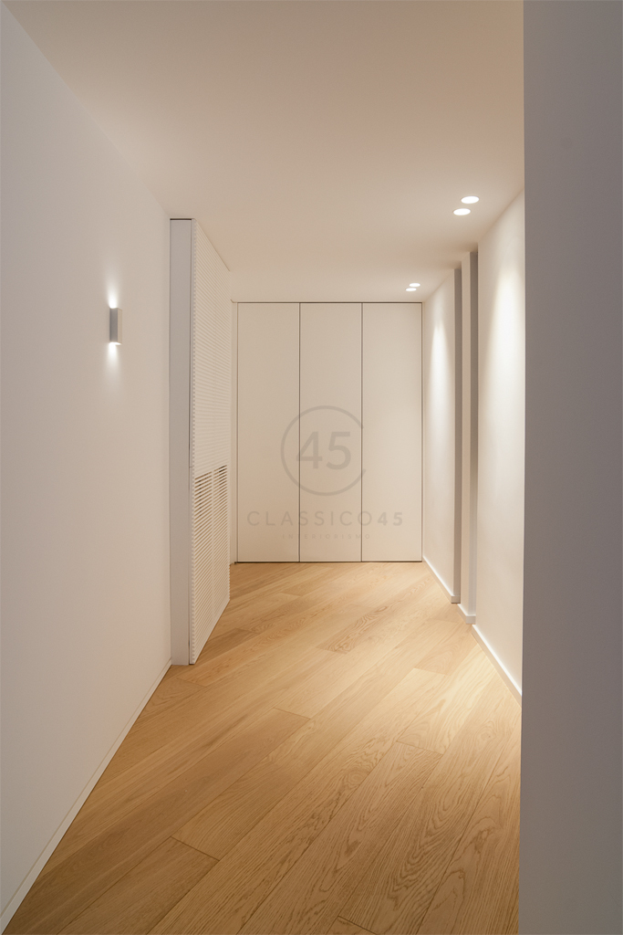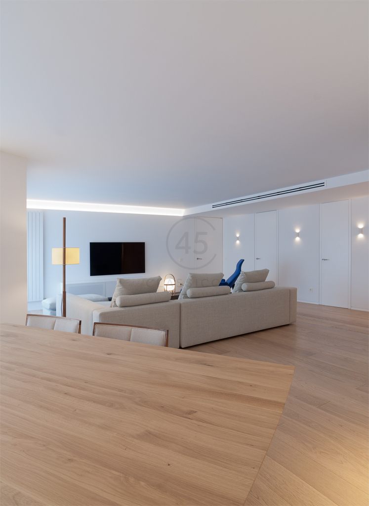 Los materiales nobles —como el roble natural en suelos y mobiliario— y una iluminación técnica cuidadosamente estudiada, aportan confort y sofisticación. El pavimento continuo de madera aceitada refuerza la calidez en todas las zonas secas de la vivienda.