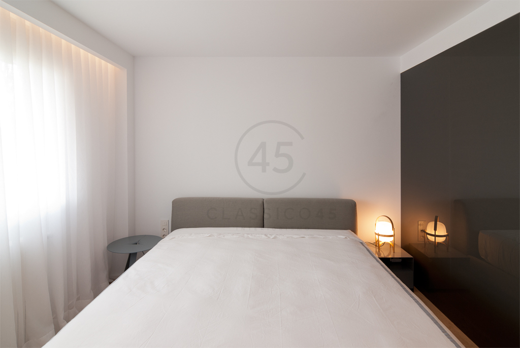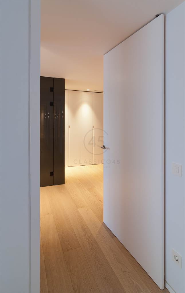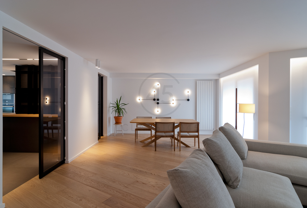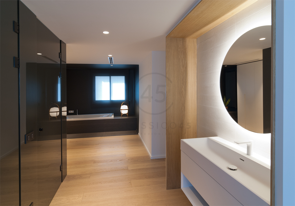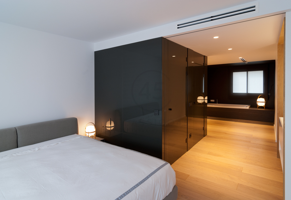 Desde el salón, cuatro puertas enrasadas diseñadas por el estudio conducen a distintas estancias: un pequeño estudio, un aseo de cortesía, un dormitorio de invitados y una suite principal. Esta última combina vestidor, baño y zona de descanso, resueltos con una paleta sobria, soluciones a medida y una cuidada iluminación ambiental. Una gran puerta corredera oculta en tabique permite independizar el dormitorio. La bañera se integra en el espacio del vestidor, en diálogo con un módulo central en cristal gris y un mueble de lavabo en MDF lacado y madera.