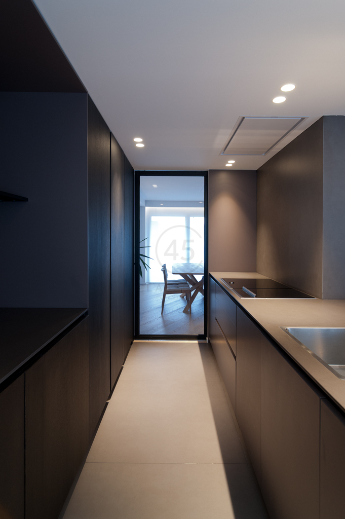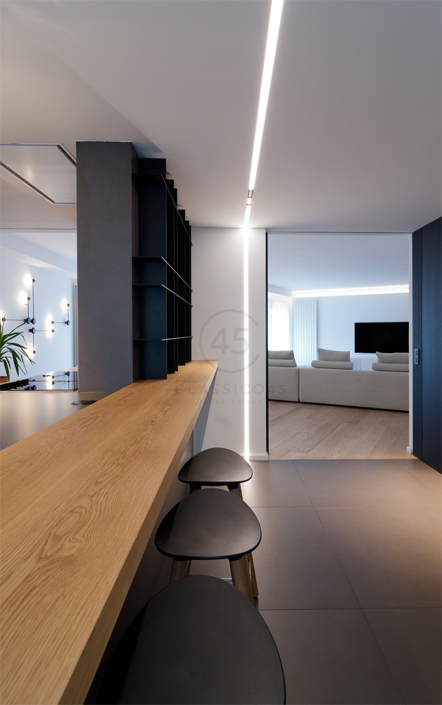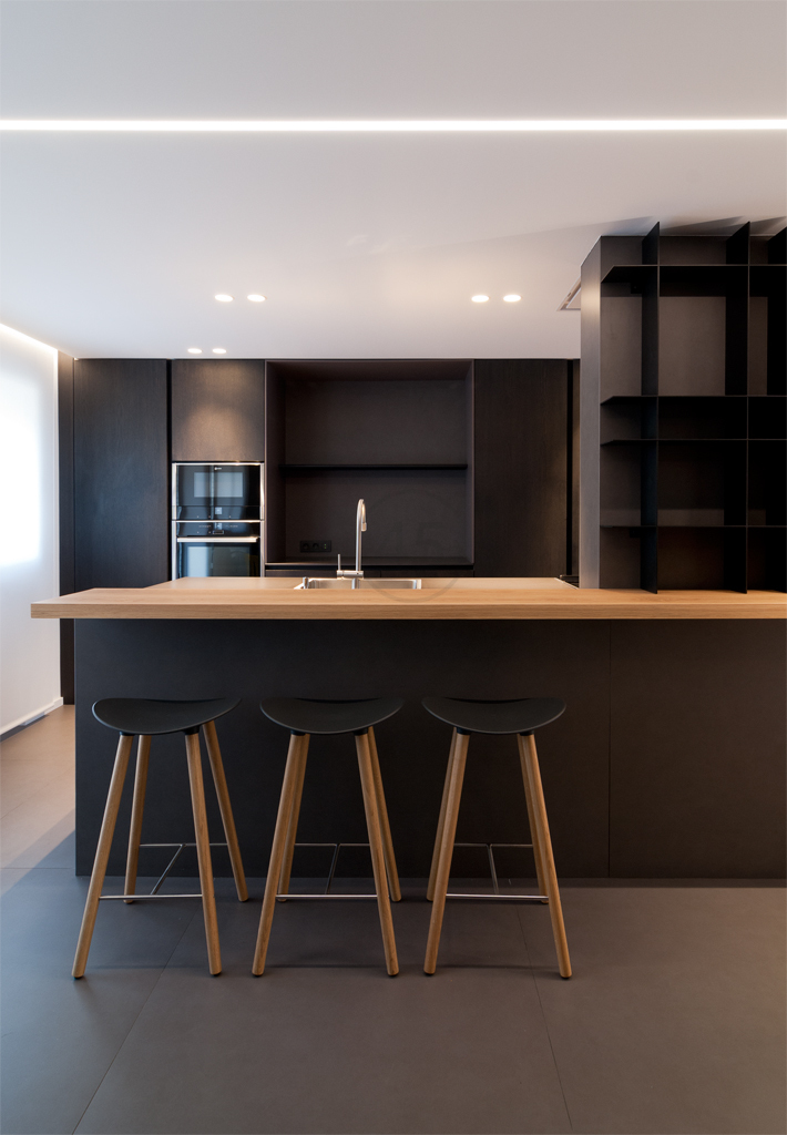 El salón se divide en zona de estar y de comedor, con mobiliario seleccionado y diseñado a medida. Las aperturas entre salón y cocina permiten una comunicación constante entre ambas zonas. La cocina combina materiales como el porcelánico Foster de Inalco, madera de roble teñido en wengué, lacados en gris y encimeras técnicas. La isla central, con placa de inducción y zona de aguas, incorpora una barra elevada en madera maciza y una estantería metálica de diseño reticulado.